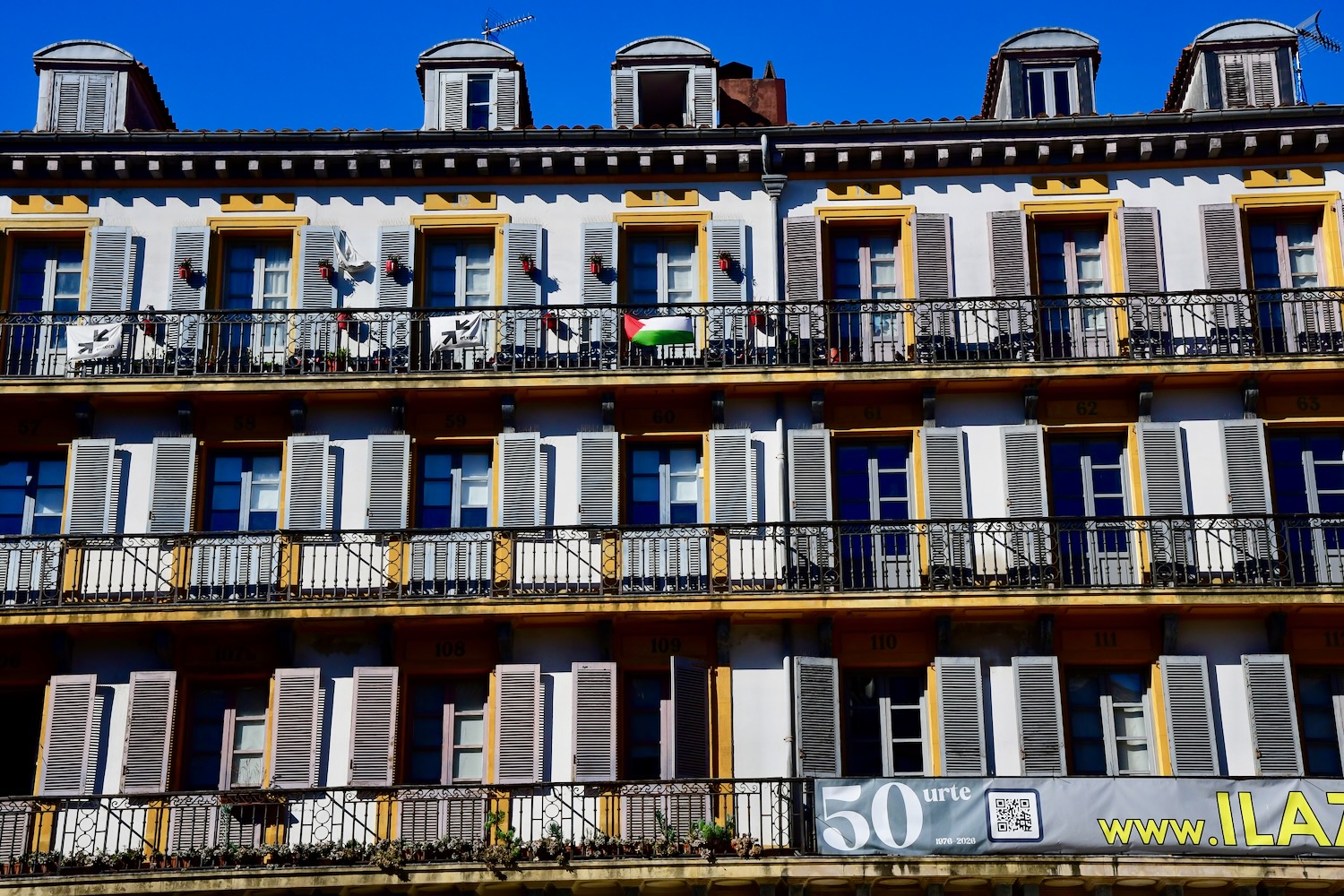 Bilbao en quelques lignes c’est : quasiment pas de fastfood et de la bonne nourriture locale, très peu de pub (même dans le métro), des piétons qui attendent le feu vert pour traverser et des voitures qui s’arrêtent pour les piétons, et surtout de nombreuses rues sans voitures ; des basques qui nous parlent en espagnol sans basculer automatiquement vers un anglais « globish » dès qu’on a des difficultés à comprendre ; et des drapeaux palestiniens sur de très nombreuses façades. En ce début mars ensoleillé les plages se sont remplies très vite.