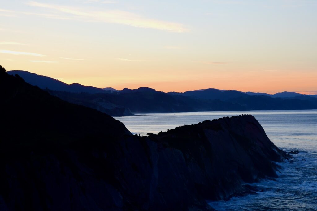 Puis, avant d’arriver à Bilbao, couché de soleil sur « la route de Flych » une formation géologique remarquable de la côte basque.