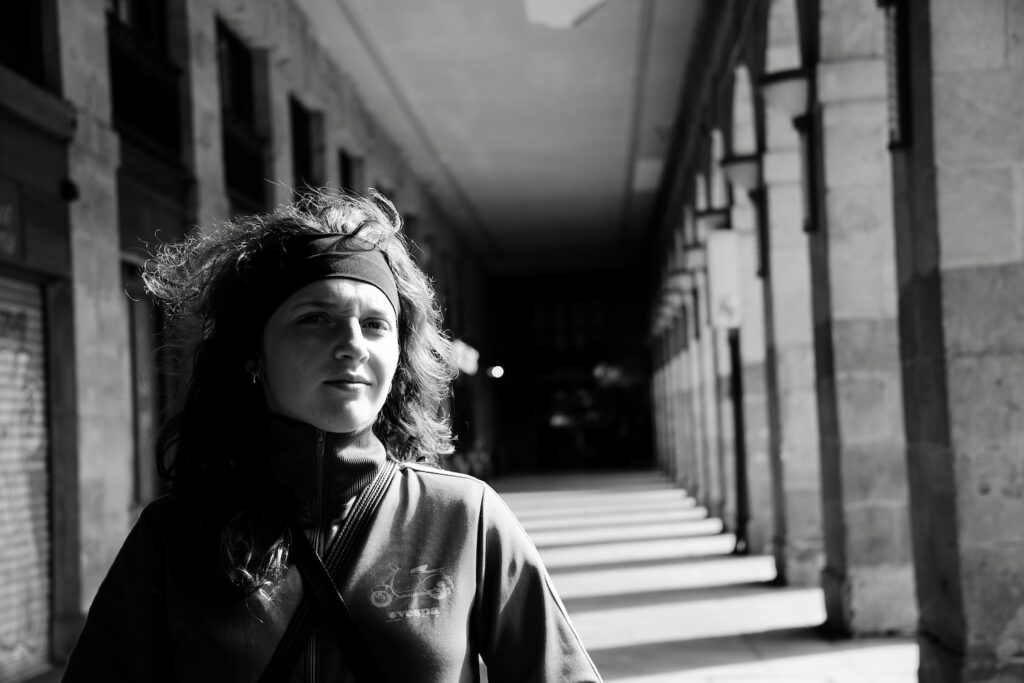 Pour les 21 ans de Louise nous lui avons offert un petit séjour à Bilbao ! La voici donc, sous les arcades de la Plaza Nueva, dans le quartier historique où nous résidions.